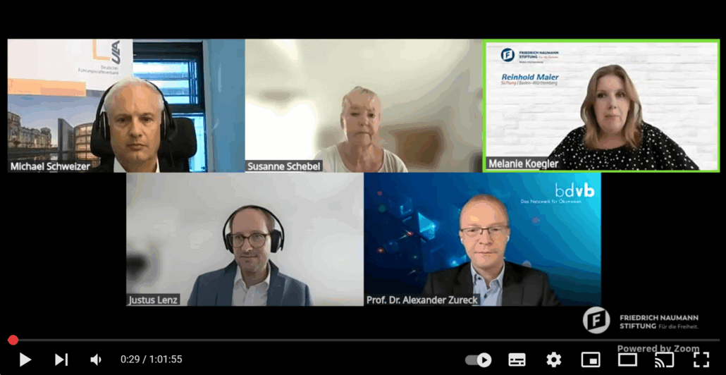 Am 24. Juni 2025 lud die Friedrich-Naumann-Stiftung für die Freiheit im Rahmen ihrer digitalen Lunchtalk-Reihe „Wirtschaft am Mittag“ zu einem Dialog zum Thema „Großes Potenzial, große Probleme – der Blick der Führungskräfte auf den Standort Deutschland“ ein. Im Mittelpunkt der Veranstaltung stand die Vorstellung der neuen Führungskräfteumfrage, die der Deutschen Führungskräfteverband ULA gemeinsam mit der Friedrich-Naumann-Stiftung und dem bdvb – Bundesverband Deutscher Volks- und Betriebswirte durchgeführt hat.