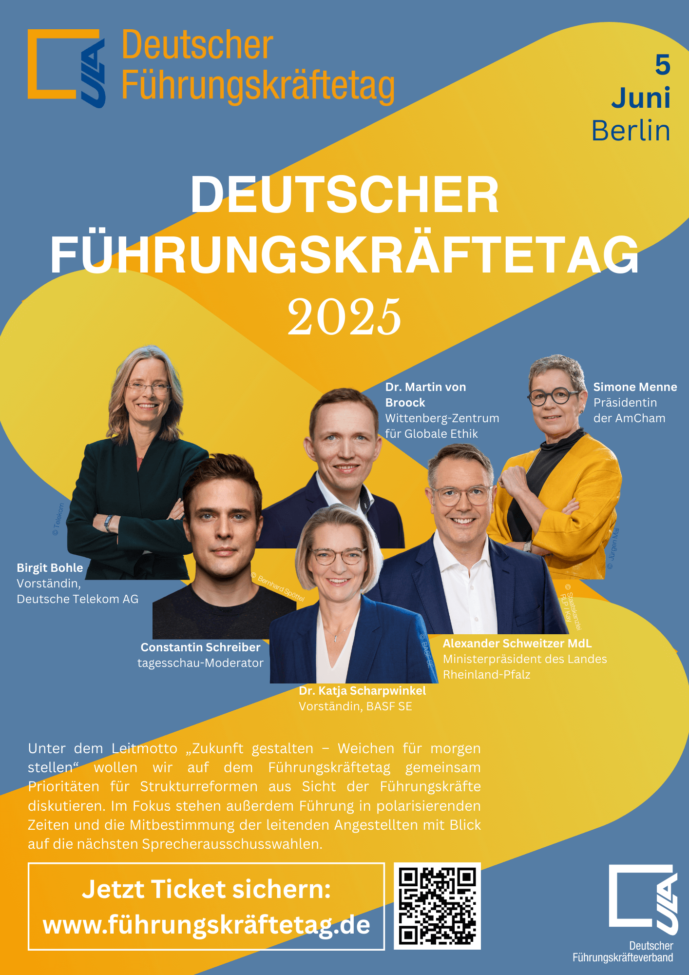 die Koalitionsverhandlungen befinden sich in der entscheidenden Phase. Die zukünftige Bundesregierung steht vor der Aufgabe, nachhaltige Reformen auf den Weg zu bringen. Um diese Notwendigkeit zu unterstreichen, haben wir die Erklärung der deutschen Wirtschaft zu den Koalitionsverhandlungen mitgezeichnet. Ein zentrales Thema in den Verhandlungen ist erneut die mögliche Erhöhung der Beitragsbemessungsgrenze in der gesetzlichen Kranken- und Pflegeversicherung. In unserer aktuellen LinkedIn-Kampagne veranschaulichen wir die erheblichen Mehrbelastungen, die eine solche Maßnahme für Fach- und Führungskräfte bedeuten würde. Wir freuen uns über Ihre Unterstützung durch Likes, Shares und Kommentare! Auch beim Deutschen Führungskräftetag am 5. Juni 2025 steht die Zukunftsgestaltung im Mittelpunkt. Unter dem Leitthema „Zukunft gestalten – Weichen für morgen stellen“ erwarten Sie hochkarätige Vorträge und Diskussionen mit renommierten Speakern. Sichern Sie sich jetzt Ihre Teilnahme! Bereits am 7. April findet unser nächster Führungskräftedialog statt. Melden Sie sich noch bis Ende der Woche an und erfahren Sie von Axel Kühn, wie gezielte Kommunikation als Schlüssel erfolgreicher Transformationsprozesse genutzt werden kann. In der neu erschienenen Ausgabe der ULA-Nachrichten erfahren Sie alles über kommende Events, Netzwerkaktivitäten und die neuesten Projekte des Deutschen Führungskräfteverbands.