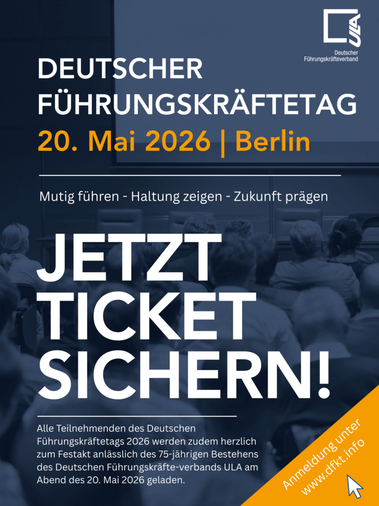 Wir freuen uns, Sie herzlich zum Deutschen Führungskräftetag 2026 am 20. Mai 2026 nach Berlin einzuladen. Unter dem Leitmotto „Mutig führen – Haltung zeigen – Zukunft prägen“ wollen wir gemeinsam mit Ihnen der Frage nachgehen, wie der Wirtschaftsstandort Deutschland seine Innovations- und Wettbewerbsfähigkeit wiedererlangen kann, wie Führungskräfte sich heute für die Zukunft aufstellen und welche Rahmenbedingungen die Arbeitswelt in den kommenden Jahren prägen werden. Im Fokus steht dabei außerdem die Mitbestimmung der Leitenden Angestellten und die Rolle des Sprecherausschusses.
