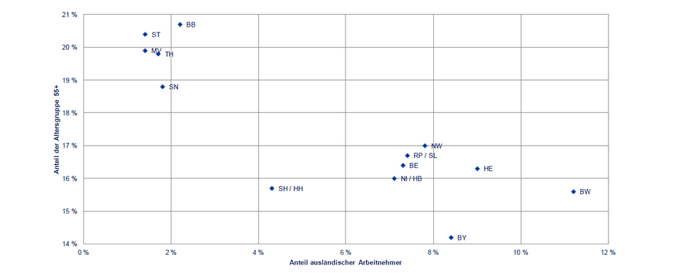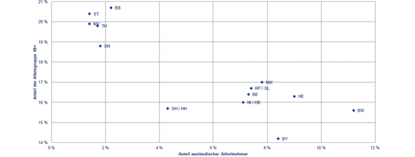 Westdeutsche Bundesländer weisen gegenüber den ostdeutschen Bundesländer einen niedrigeren Anteil älterer Arbeitnehmer und einen höheren Anteil ausländischer Arbeitnehmer auf. Auch in einer Gesamtbetrachtung ergibt sich ein klarer statistischer Zusammenhang. Eine mögliche Deutung: Zuwanderung hat einen positiven Einfluss auf die Altersstruktur auf dem Arbeitsmarkt. Eine weitere Deutungsmöglichkeit: Arbeitsmärkte mit einer günstigen Altersstruktur sind besonders aufnahmefähig für Migranten.