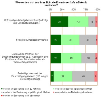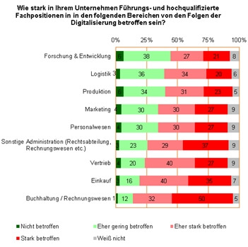 Führungskräfte trauen der Digitalisierung ein erhebliches Veränderungspotential für Wirtschaft und Arbeitsleben zu, wie sich aus der Auswertung einer weiteren Umfrage zum Thema „Führen 4.0“ ergibt. Zunächst erwarten Sie wesentlich mehr Flexibilität in den Erwerbsverläufen, das heißt mehr freiwillige und unfreiwillige Wechsel des Arbeitsplatzes, aber auch der Beschäftigungsformen. Die Befragten erwarten auch in ihren Unternehmen starke Auswirkungen auf nahezu alle Funktionsbereiche, wobei die administrativen (in der Terminologie von produzierenden Unternehmen „indirekten“) Funktionen tendenziell stärker betroffen sein könnten.