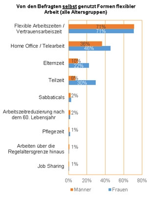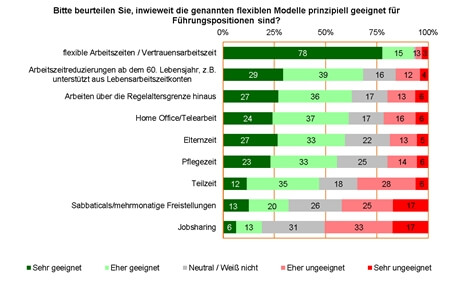 In einem auffälligen Missverhältnis zur der sehr zurückhaltenden Nutzung flexibler Arbeitsformen steht die Bewertung ihrer grundsätzlichen Eignung für Führungskräfte. Neben Vertrauensarbeitszeit, Elternzeit und Homeoffice halten mehr als die Hälfte der Umfrageteilnehmer auch flexible Arbeitsformen wie Pflegezeit, rentennahe Arbeitszeitreduzierungen oder ein Arbeiten über die Regelaltersgrenze hinaus für grundsätzlich geeignet für Führungskräfte.