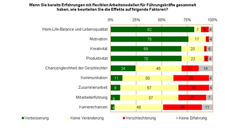 Außerdem bescheinigen mehr als zwei Drittel der Befragten der Nutzung flexibler Arbeitsmodelle positive Effekte auf die Vereinbarkeit von Familie, Beruf und Karriere sowie die Motivation, die Kreativität und die Produktivität. Tendenziell negative Effekte ergeben sich für die Kommunikation und die Zusammenarbeit. Mitarbeiterführung wird also bei einem Mehr an Flexibilität tendenziell schwieriger. Bedenklich ist: 38 Prozent sehen das Risiko von Karrierenachteilen durch die Nutzung flexibler Arbeitsformen. Hier ist offensichtlich noch vielerorts eine starke Präsenzkultur wirksam: nicht nur der persönliche Kontakt, sondern auch die unmittelbare Sichtbarkeit im Unternehmen sind demnach weiterhin karriererelevante Faktoren.