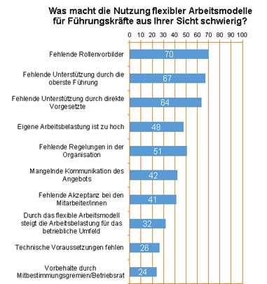 Eindeutig fällt auch das Urteil der Befragten über die Hemmnisse für eine stärkere Verbreitung flexibler Arbeitsformen aus. Diese Antworten liefern Hinweise auf die Ursachen für das beschriebene Missverhältnis zwischen der positiven Bewertung und der spärlichen Nutzung flexibler Arbeitsformen: Es fehlt insbesondere an positiven Rollenvorbildern für Führungskräfte (70 Prozent), an Unterstützung durch die oberste Führung (67 Prozent) und durch direkte Vorgesetzte (64 Prozent).