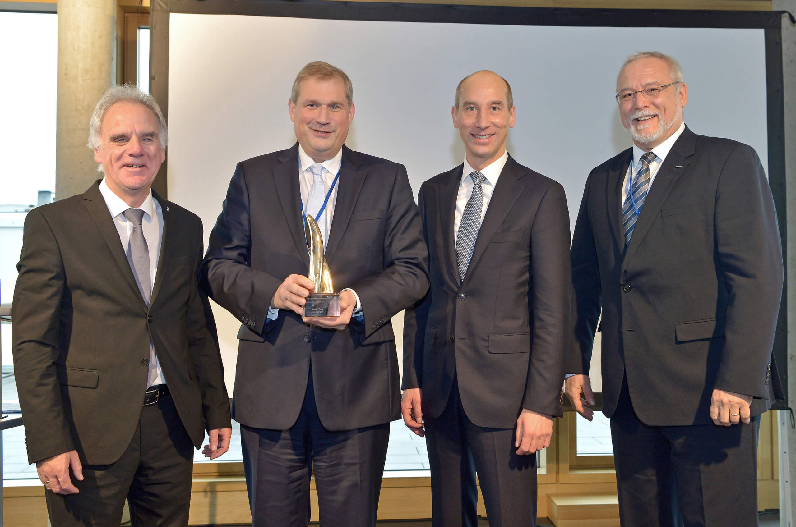 (v.l.n.r.) Rainer Nachtrab, 1. Vorsitzender des VAA; Dr. Frank Heinricht, Vorstandsvorsitzender der Schott AG; Dr. Thomas Toepfer, Finanzvorstand und Arbeitsdirektor der Covestro AG; Dr. Roland Leroux, Präsident der Vereinigung der Deutschen Führungskräfteverbände – ULA