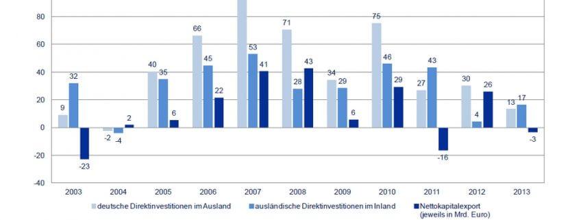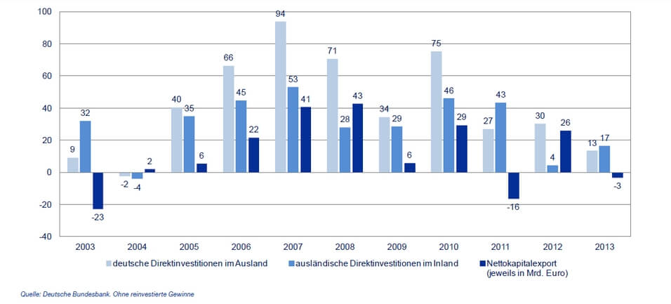 Zwischen 2003 und 2013 lagen die Direktinvestitionen deutscher Unternehmen im Ausland insgesamt rund 113 Milliarden Euro höher als die Direktinvestitionen ausländischer Unternehmen in Deutschland.