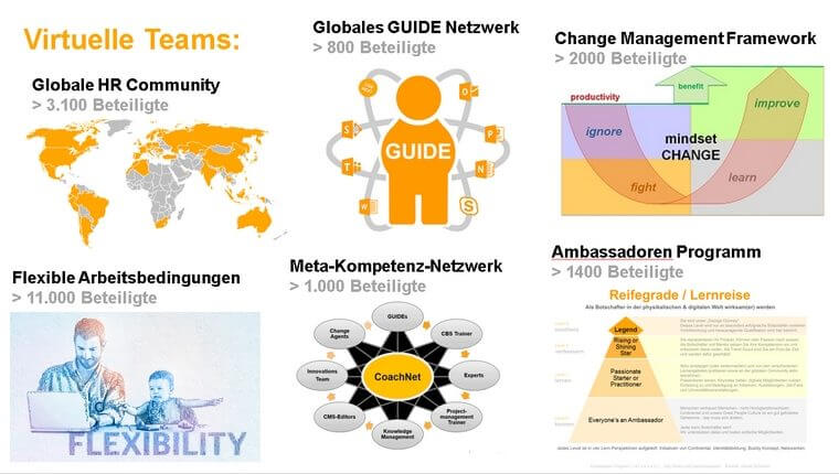 Virtuelle Teams bei Continental: Global HR-Community mit 3.100 Teilnehmern, Globales Guide Netzwerk mit 800 Teilnehmern, Change Management Framework mit 2.000 Teilnehmern, Flexible Arbeitsbedingungen mit 11.000 Teilnehmern, Meta Kompetenz Netzwerk mit 1.000 Teilnehmern und Ambassadoren Programm mit 1.400 Teilnehmern.