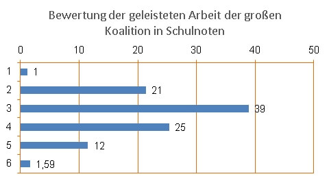 Die Umfrage zeichnet ein aufschlussreiches Bild von der Stimmungslage der Führungskräfte zu Beginn des Wahlkampfes. Mit der ersten Frage wurde eine Bewertung der Arbeit der Großen Koalition in den letzten vier Jahren erbeten. Das Endzeugnis fällt mit 3,3 eher durchwachsen aus.