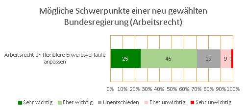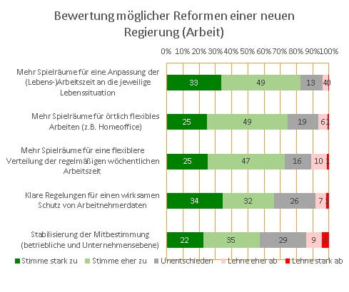 Im Bereich Arbeitsrecht würde die Fortsetzung eines der zentralen Reformprojekte der Großen Koalition auf breite Zustimmung stoßen, nämlich die Anpassung des Arbeits- und Sozialrechts an flexiblere Erwerbsverläufe, wie sie im Konzept „Arbeiten 4.0“ vorgeschlagen werden. 70 Prozent halten dies für wichtig. Diese generelle Zustimmung schließt auch die meisten der zur Bewertung gestellten möglichen Einzelmaßnahmen ein. So stimmen 80 Prozent größeren Spielräumen für eine Anpassung der Arbeitszeit an die aktuelle Lebenssituation zu. 75 Prozent wollen mehr Bestimmungsrechte über den Arbeitsort, wie etwa Arbeiten aus dem Homeoffice und 70 Prozent mehr Flexibilität bei der Verteilung der Arbeitszeit über eine Arbeitswoche. Politische Forderungen zu diesen Aspekten haben nahezu alle Parteien in ihren Programmen. Unterschiede betreffen die Details wie die Reichweite und die Durchsetzbarkeit von Rechtsansprüchen der Arbeitnehmer, den Schutz der Dispositionsrechte des Arbeitgebers und den Umfang nicht verhandelbarer, abschließend gesetzlich geregelter Vorschriften.
