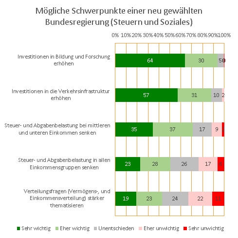 Zu möglichen Steuer- und Abgabensenkungen, die zu mehr Investitionen tendenziell in einem Zielkonflikt stehen, ist das Meinungsbild differenziert: 73 Prozent halten eine Entlastung von mittleren und geringen Einkommen für wichtig, aber nur 49 Prozent eine Entlastung aller Einkünfte. Immerhin 44 Prozent sind der Auffassung, dass Verteilungsfragen wie Vermögens-, und Einkommensverteilung stärker thematisiert werden müssten. Führungskräfte sind also offenbar teilweise bereit, von eigenen finanziellen Interessen abzusehen und „das große Ganze“ im Blick zu behalten.