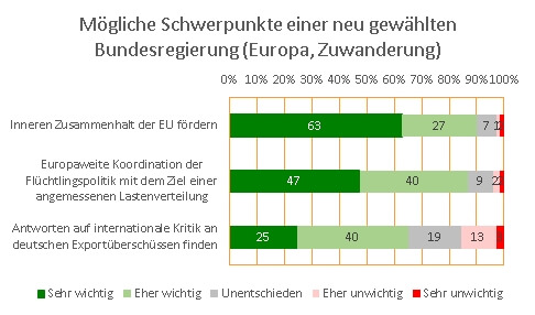 Noch breiter als in einigen innenpolitischen Fragen ist der Konsens unter den Führungskräften über die künftige Europapolitik. Unter den möglichen Prioritäten einer künftigen Regierung erzielt die Antwortkategorie „den innenpolitischen Zusammenhang der EU fördern“ 90 Prozent Nennungen als „sehr wichtig“ oder „wichtig“. Eine weitere „Koordinierung der Flüchtlingspolitik“ ist mit 87 Prozent ebenfalls eine Top-Priorität. Dass es dabei nicht um eine rein zahlenmäßige Begrenzung des Zuzugs geht, zeigen die Antworten auf die Beurteilung eines möglichen Zuwanderungsgesetzes für qualifizierte Fachkräfte: 72 Prozent würden einer solchen Maßnahmen zustimmen.