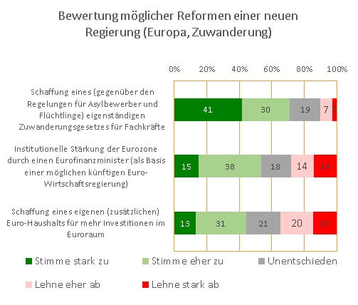 Weitere Souveränitätsverzichte in der Wirtschafts- und Finanzpolitik werden hingegen geteilt beurteilt: So kann sich immerhin die Hälfte der Befragten eine „institutionelle Stärkung der Eurozone durch einen Eurofinanzminister“ vorstellen – als Basis einer möglichen künftigen Euro-Wirtschaftsregierung. 30 Prozent lehnen dies ab, 20 Prozent sind unentschieden. Die Schaffung eines eigenen „zusätzlichen Euro-Haushalts für mehr Investitionen im Euroraum“ unterstützen hingegen nur 42 Prozent. 24 Prozent sind unentschiedenen und 34 Prozent ablehnend.