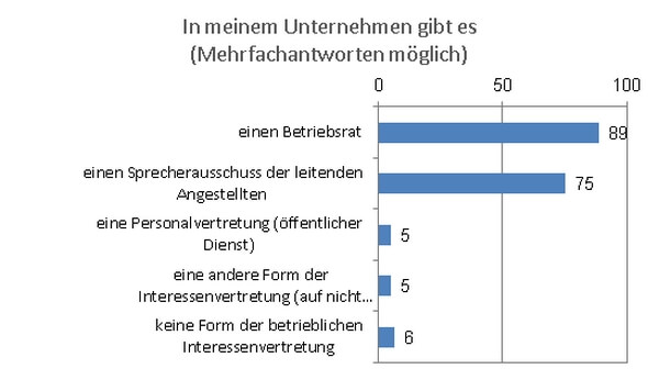 Die Umfrageteilnehmer stammen nahezu alle aus Unternehmen mit betrieblichen Mitbestimmungsgremien. Bei 89 Prozent gibt es einen Betriebsrat und bei 75 Prozent einen Sprecherausschuss der leitenden Angestellten. Personalvertretungsgremien des öffentlichen Dienstes oder andere Vertretungsformen auf nicht gesetzlicher Grundlage werden von jeweils fünf Prozent vermeldet. Aus komplett mitbestimmungsfreien Unternehmen stammen nur sechs Prozent der Befragten. Die hohen Werte sind nicht überraschend. Die Geschichte der ULA und ihrer Verbände ist aufs engste mit Mitbestimmungsfragen verknüpft, insbesondere mit der Etablierung des Sprecherausschussgesetzes, einem Ziel, das 1988 erreicht wurde – 37 Jahre nach Gründung der ULA im Jahr 1951 als politischer Dachverband.