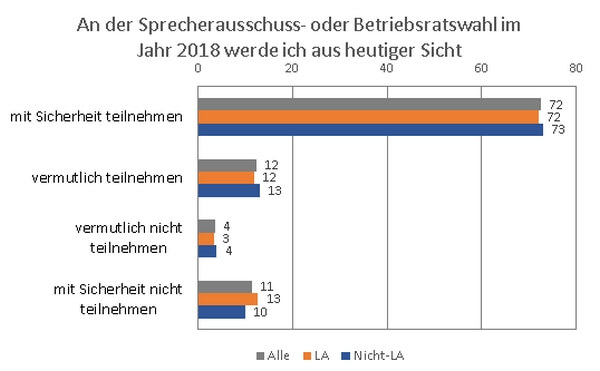 Traditionell ist in den Unternehmen die Wahlbeteiligung ein wichtiger Indikator für die Akzeptanz der betrieblichen Mitbestimmung und für die spätere Durchsetzungskraft der gewählten Vertreter. Hier stimmen die Umfrageergebnisse ermutigend: Leitende und nichtleitende Angestellte wollen zu jeweils 73 Prozent „mit Sicherheit“ und zu acht Prozent „vermutlich“ an den Wahlen teilnehmen. Bei den leitenden Angestellten ist dies sicherlich auch das Ergebnis der Arbeit der gewählten Vertreter in der zu Ende gehenden Amtsperiode. Mit ihr sind insbesondere die leitenden Angestellten sehr zufrieden.