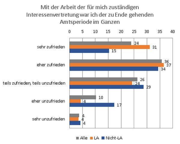 Das höhere Zufriedenheitsniveau unter Leitenden überrascht nicht, da der Organisationsgrad der ULA-Verbände unter Sprecherausschussmitgliedern traditionell sehr hoch ist. Hier ist es den Gewählten möglich, die Akzente bei der Interessenvertretung eigenständig zu setzen. Im Bereich der Betriebsratsarbeit, wo Führungskräfteverbände wie der VAA in der Chemiebranche ebenfalls erfolgreich engagieren, erreichen Listen mit Führungskräften beziehungsweise außertariflichen Angestellten zumeist die Position starker Minderheitenfraktionen.