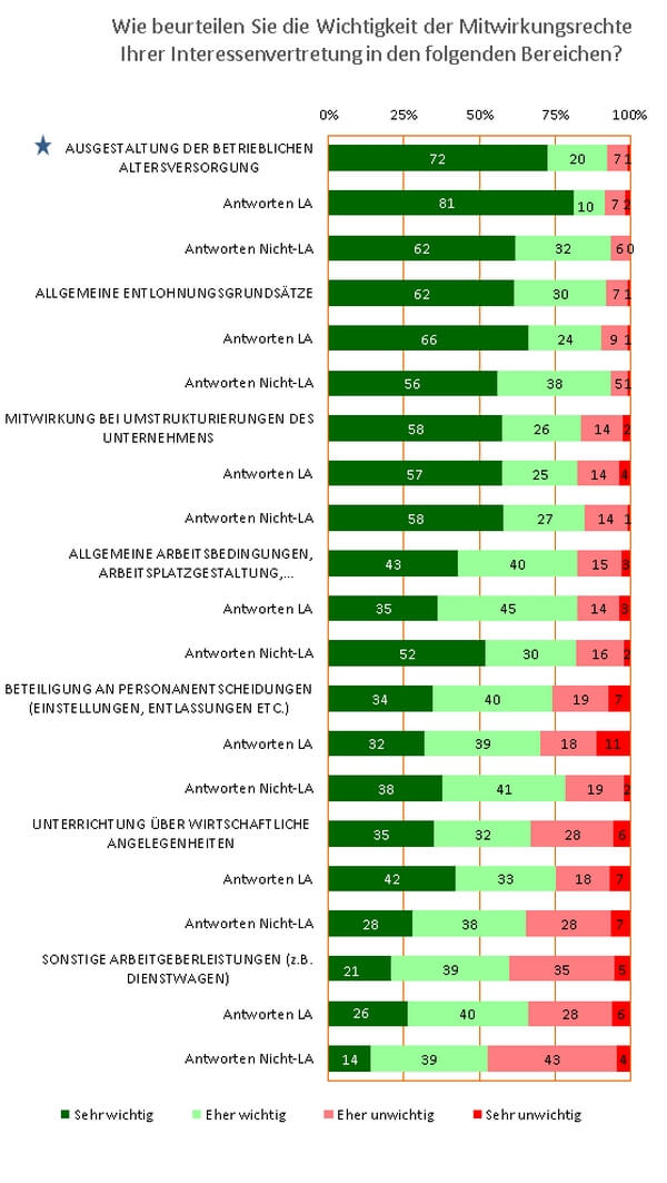 An der Spitze der Punkte, bei denen eine wirksame betriebliche Interessenvertretung gewünscht wird, stehen die „allgemeinen Entlohnungsgrundsätze“ und die „Ausgestaltung der betrieblichen Altersversorgung“. Das Thema Betriebsrente ist die einzige Antwortkategorie, bei der es in der obersten Antwortkategorie statistisch signifikante Unterschiede gab: 81 Prozent der Umfrageteilnehmer mit dem Status des leitenden Angestellten sehen dieses Thema als „sehr wichtig“ an, aber nur 62 Prozent der Befragten ohne diesen Status.
