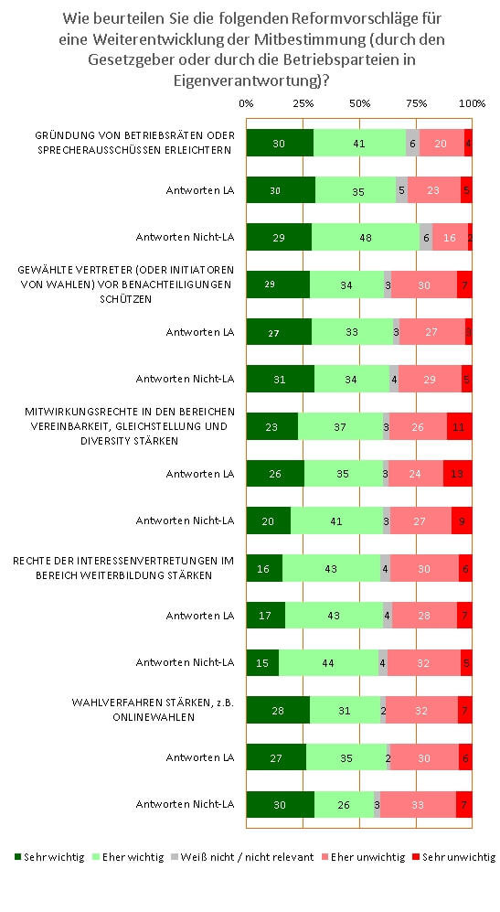 Zustimmungswerte von über 60 Prozent (Antwortkategorien: „sehr wichtig“ oder „eher wichtig“) erzielen eine Erleichterung der Wahlverfahren (zum Beispiel durch Onlinewahlen) sowie die (Neu-)Gründung von Betriebsräten oder Sprecherausschüssen, eine Verbesserung des Schutzes gewählter Vertreter (oder Initiatoren von Wahlen) vor Benachteiligungen und die Nutzung der Mitwirkungsrechte in Fragen der Vereinbarkeit, Gleichstellung und Diversity. Etwas dahinter, aber immer noch mehrheitlich unterstützt, rangiert die Idee, die Rechte der Interessenvertretungen in Fragen der Weiterbildung zu stärken.