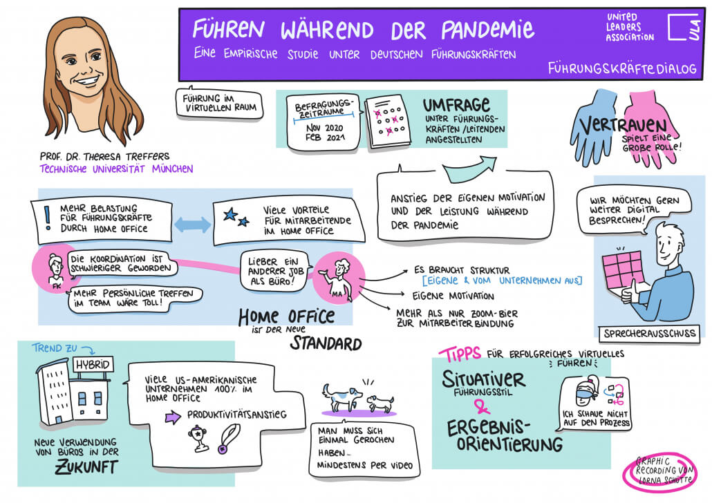 Professorin Treffers hob hervor, auf welche Erfolgsfaktoren es bei virtuell arbeitende Teams ankommt: Bindung an die Unternehmen, Vertrauen ins Team und die Team-Motivation. Im Mittelpunkt der Debatte mit den Führungskräften aus der unternehmerischen Praxis stand die Frage, wie mit dem neuen Standard „homeoffice“ umgegangen werden soll. Da es eine vollständige Rückkehr in die Büros nicht geben werde, empfiehlt die Expertin den Mitarbeitenden mehr Vertrauen entgegenzubringen sowie eine Ergebnis- statt Prozessorientierung. Einen Überblick über alle zentralen Studienergebnisse erhalten Interessierte in der Ausgabe Juni 2021 der ULA-Nachrichten.