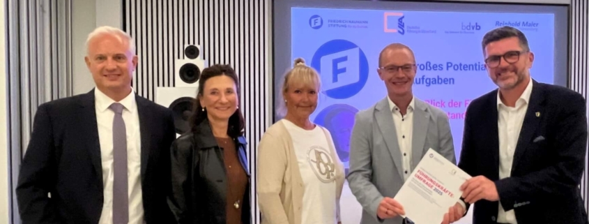 In der anschließenden Diskussion wurden die Ergebnisse eingeordnet und weiter vertieft. Neben Niko Reith MdL (wirtschaftspolitischer Sprecher der FDP/DVP-Landtagsfraktion) und Susanne Schebel (1. Vorsitzende des VFF) nahm auch Prof. Dr. Alexander Zureck (Vizepräsident des bdvb) teil. Gemeinsam mit dem Publikum entstand ein lebhafter Austausch über notwendige Reformen, die Rolle von Führungskräften im Transformationsprozess und die Zukunftsfähigkeit des Standorts Deutschland.