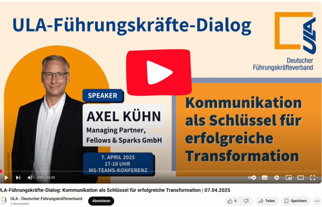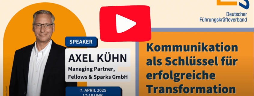 Am 7. April 2025 fand im Rahmen unserer digitalen Veranstaltungsreihe Führungskräfte-Dialoge ein Dialog zum Thema „Kommunikation als Schlüssel für erfolgreiche Transformation“ mit Axel Kühn, Managing Partner von Fellows & Sparks, statt. Im Mittelpunkt stand die zentrale Rolle der Kommunikation in Transformationsprozessen – klar, praxisnah und mit besonderem Fokus auf die Verantwortung von Führungskräften.