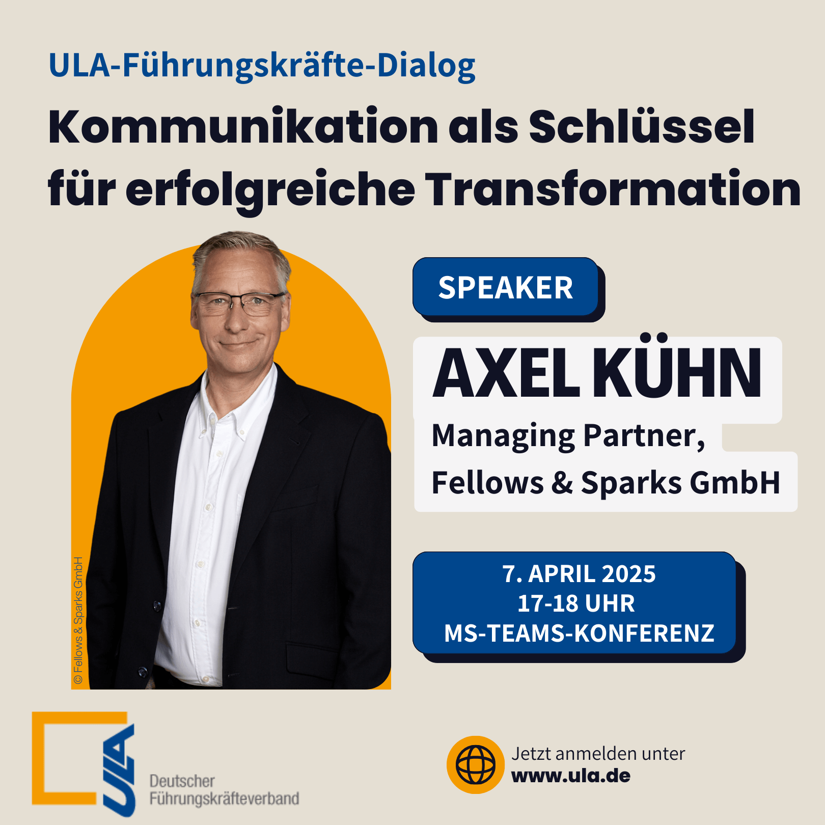 Wie können Unternehmen durch Kommunikation zukunftsfähig werden? Einladung zum digitalen Dialog mit Axel Kühn, Managing Partner, Fellows & Sparks GmbH: Kommunikation als Schlüssel für erfolgreiche Transformation.
