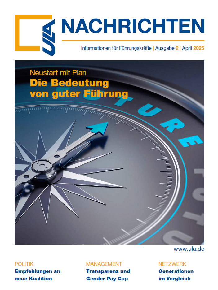Lesen Sie u.a. unser Interview mit Prof. Dr. Carsten Schermuly zu seinem neuen Buch "Die Psychologie der Macht"; welche Handlungsempfehlungen die ULA für die neue Regierung hat; und den Gastbeitrag von Uta Zech (BPW) zur Gehaltstransparenz und Gender Pay Gap.