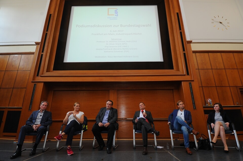 Die ULA hatte geladen, die Politiker sind gekommen. Am 3. Juli 2017 trafen im Industriepark Höchst in Frankfurt zur Podiumsdiskussion mit Führungskräften Vertreter von fünf Parteien aufeinander.
