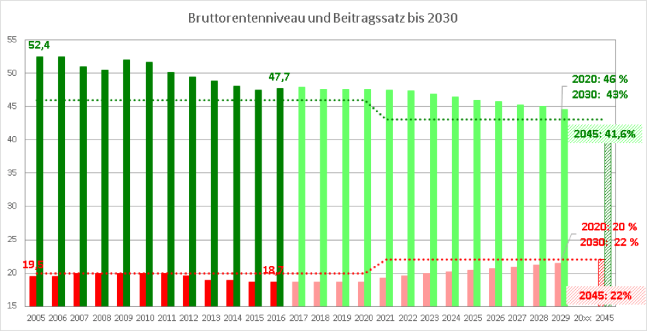 Zur Erinnerung: Ausgangspunkt der Reformen war ein Bruttorentenniveau (Bruttoeinkommen abzüglich Rentenversicherungsbeiträge abzüglich möglicher Riester-Beiträge) von rund 53 Prozent für einen Standrentner (45 Jahre pflichtversichert zum Durchschnittseinkommen) und ein Beitragssatz von 19,5 Prozent. Das Rentenniveau sollte sinken: aber nicht unter 46 Prozent bis 2020 und nicht unter 43 Prozent bis 2030. Der Beitragssatz sollte nur mäßig steigen: auf maximal 20 Prozent bis 2020 und auf maximal 22 Prozent bis 2030. Heute (2016) liegt das Rentenniveau bei 47,8 Prozent und der Beitragssatz bei 18,7 Prozent. Dies sieht auf den ersten Blick nach einer Zielübererfüllung aus, liegt aber im Rahmen der damaligen Prognosen, die die derzeitigen Jahre als eine Art „demografischer Atempause“ eingestuft hatten.
