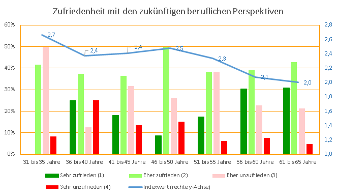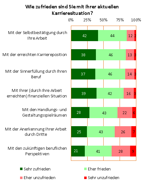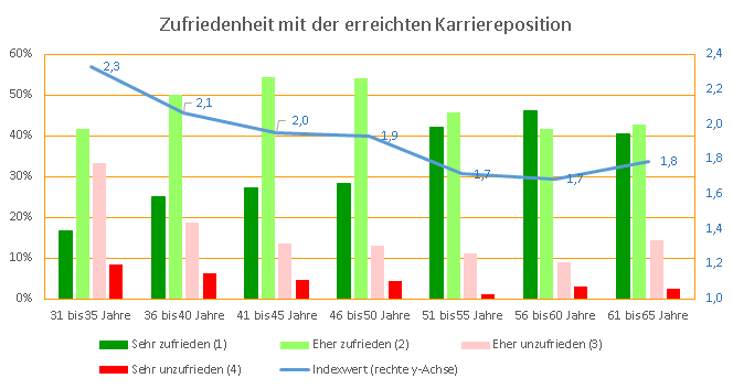 Die Zufriedenheit wurde in mehreren Dimensionen auf einer vierstufigen Skala gemessen. Umgerechnet in einen Indexwert, der von 1 (sehr zufrieden) bis 4 (sehr unzufrieden) reicht, ergibt sich folgende Spitzengruppe: „Selbstbestätigung durch die Arbeit“ (1,75), „erreichte Karriereposition“ (1,8) und „durch Arbeit erreichte finanzielle Situation“ (1,83). Am Ende stehen die „Handlungs- und Gestaltungsspielräume“ (2,06), die „Anerkennung der Arbeit durch Dritte“ (2,15) und die „künftigen beruflichen Perspektiven“ (2,26). Die Mitte der Skala, ab der mehrheitliche Unzufriedenheit herrscht, bildet der Wert 2,5. In den meisten Antwortkategorien gibt es einen schwachen, statistisch signifikanten Alterstrend. Die Zufriedenheit steigt also mit zunehmendem Alter leicht an.