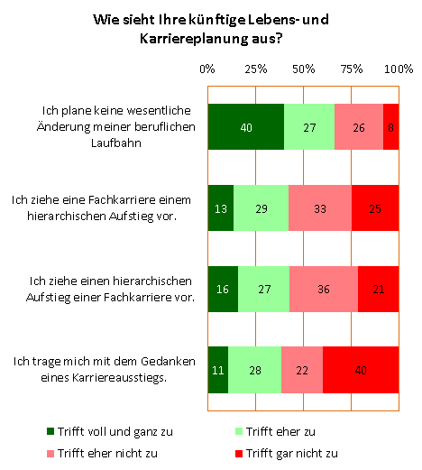 Eher überraschend: Trotz des guten Klimas bewertet ein Drittel der Befragten die Aussage „Ich plane derzeit keine wesentlichen Änderungen an meiner Karriere“ mit „trifft eher nicht zu“ oder „trifft gar nicht zu“. 38 Prozent tragen sich mit dem Gedanken eines Karriereausstiegs. Auch hier gibt es einen signifikanten Alterstrend: Offenbar erscheinen grundlegende Veränderungen an der Karriereplanung mit zunehmendem Alter immer weniger vorstellbar. Auch der Gedanke an ein Karriereende nimmt, erwartbar, mit zunehmendem Alter zu., beträgt aber auch in der Altersgruppe unter 45 Jahren beträgt der Anteil derer, die ein Karriereende mehr oder weniger in Betracht zieht, immerhin 32 Prozent.