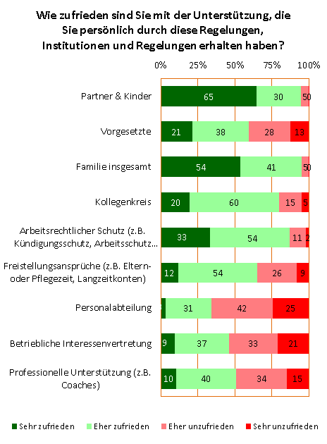 Die Prioritätensetzung zugunsten der Familie spiegelt sich auch in den Antworten auf zwei weiteren Frage wider: Dabei wurde in einem ersten Schritt die Wichtigkeit von Personen, Institutionen und Regelungen im Hinblick auf ihren Beitrag zu einer gelungenen Lebens- und Karriereplanung bewertet. In einem zweiten Schritt sollten die Befragten ihre Zufriedenheit angeben (vgl. Grafik). Partner, Kinder und Familie stehen sowohl bei der Wichtigkeit als auch bei der Zufriedenheit an der Spitze – und zwar ohne signifikante Unterschiede in allen Altersgruppen. Es handelt sich bei den Antworten daher nicht um einen Reflex aus einer Zeit, in der das „männliche Ernährermodell“ noch stärker verbreitet war als heute.