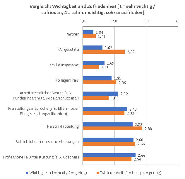 Betriebliche Interessenvertretungen, die vorrangig eine Schutzfunktion haben, werden für die Karriereplanung offenbar als wenig wichtig angesehen. Ob es im Betrieb der Befragten eine Vertretung gibt, wurde außerdem nicht erhoben. Auffällig ist: Vorgesetzten wird eine wichtige Rolle zugewiesen. Sie erfüllen die Erwartung aber offensichtlich nicht vollständig. Sowohl bei der Wichtigkeit als auch bei der Zufriedenheit liegen die Werte für die Personalabteilungen eher niedrig.
